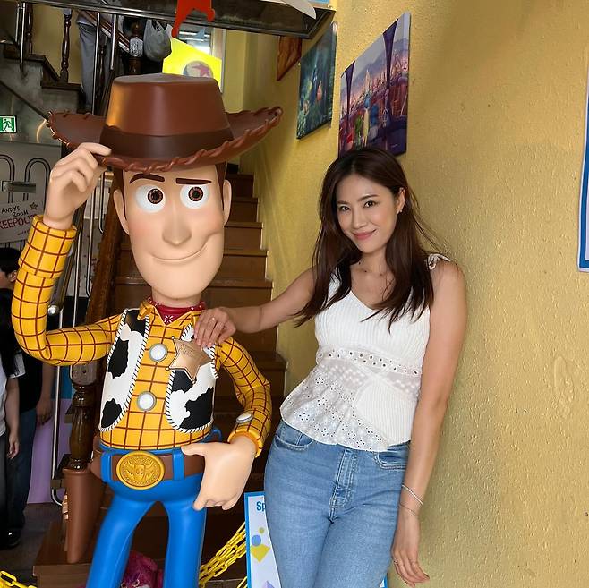 토이 스토리 캐릭터와 함께한 사진에서 스텔라 전율은 화이트 니트 베스트로 깔끔한 룩을 연출하고 있다. 아이홀 디테일이 포인트인 베스트와 데님 팬츠의 조합으로 심플하면서도 세련된 분위기를 완성했다. 실버 브레이슬릿 등의 액세서리로 미니멀한 스타일링에 포인트를 주며, 전체적으로 단정하면서도 모던한 매력을 보여주고 있다.