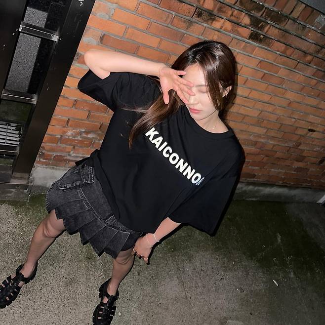스텔라 전율은 'KAICONNOI' 레터링이 돋보이는 블랙 오버사이즈 티셔츠로 스트리트 패션을 연출하고 있다. 그레이 데님 스커트와 블랙 샌들의 조합으로 편안하면서도 트렌디한 분위기를 만들어냈다. 특히 오버사이즈 핏의 티셔츠가 캐주얼한 매력을 극대화하며, 손으로 얼굴을 가리는 포즈가 자연스러운 연출을 완성하고 있다.