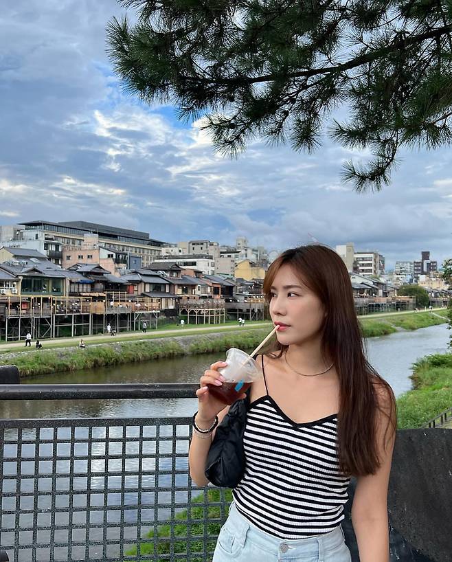 도시적인 배경에서 스텔라 전율은 블랙 앤 화이트 스트라이프 탱크톱으로 클래식한 매력을 연출하고 있다. 하이웨이스트 라이트 데님과의 조합으로 스포티하면서도 깔끔한 스타일링을 완성했다. 음료를 들고 있는 자연스러운 포즈와 함께 일상적이면서도 세련된 룩을 보여주고 있다.