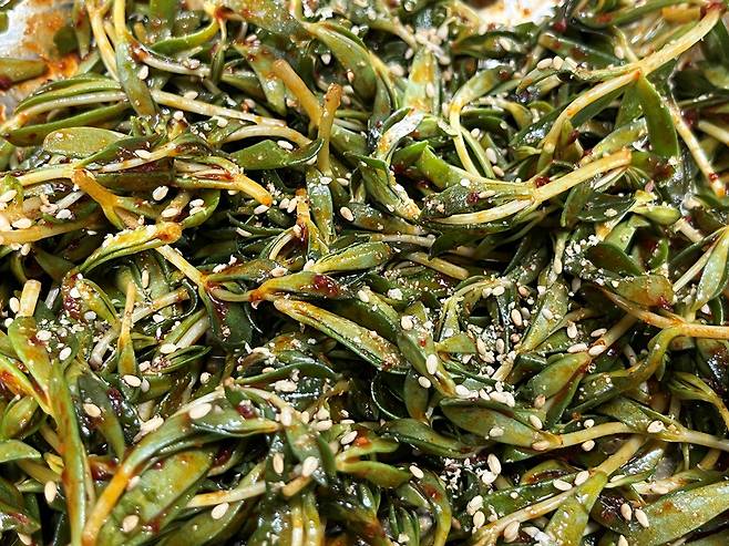 돌나물 구석구석 양념장이 잘 배도록 무쳐 주세요. 그리고 마지막에 통깨를 넣습니다. 돌나물은 양념을 해 놓으면 숨이 금방 죽기 때문에 드실 때마다 새로 무쳐 드시고, 먹기 직전 무치는 것을 추천합니다.
