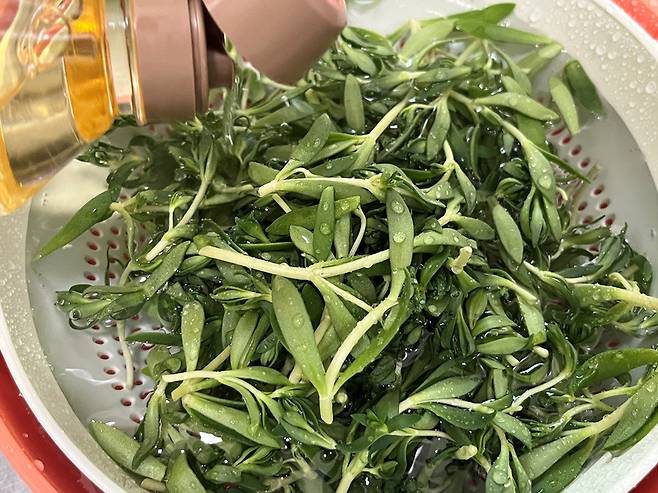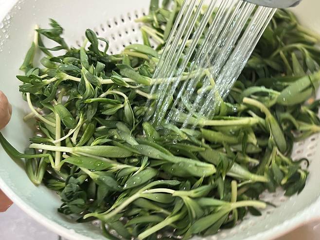 나물을 생으로 무칠 때는 물기 제거가 정말 중요합니다. 나물에 물기가 남아 있으면 양념이 제대로 배지 않고, 무쳐 놓은 뒤 시간이 지나면서 물이 생기거나 맛이 싱겁게 퍼질 수 있습니다. 키친타월로 톡톡 두드려가며 남은 물기를 최대한 제거하세요.