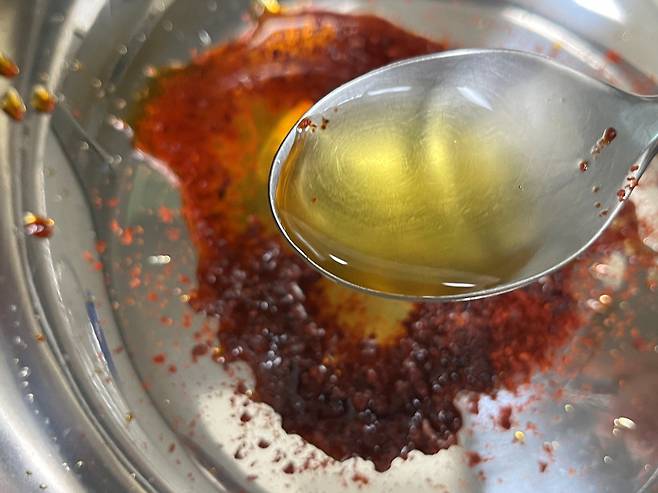 고추장 0.5 스푼과 참기름 2스푼도 넣으세요. 고추장을 많이 넣으면 오히려 텁텁해지기 때문에 고추장은 반스푼 또는 1/3스푼만 넣습니다 .매콤한 맛이 부족하다 싶으면 고춧가루를 조금 더 넣으세요.