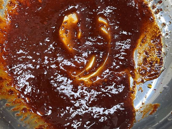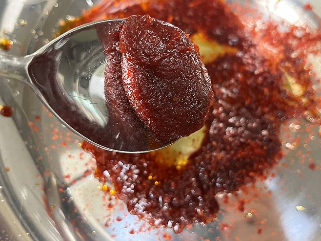넣은 양념은 잘 저어서 약간 걸쭉한 느낌이 나도록 해 주세요. 초고추장 느낌도 살짝 납니다. 매콤, 달콤, 새콤한 맛이 살아있어야 맛있는 양념이 돼요. 간을 보시고 부족한 것을 보충하세요.