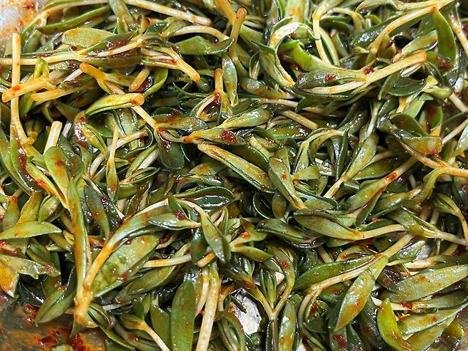 물기 제거한 돌나물을 양념장에 넣고 젓가락으로 아주 살살 무칩니다. 돌나물은 잎이 연하기 때문에 세게 무치거나 손으로 힘껏 주무르면 금방 숨이 죽고 물러지면서 식감이 망가질 수 있습니다.
