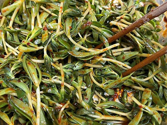 물기 제거한 돌나물을 양념장에 넣고 젓가락으로 아주 살살 무칩니다. 돌나물은 잎이 연하기 때문에 세게 무치거나 손으로 힘껏 주무르면 금방 숨이 죽고 물러지면서 식감이 망가질 수 있습니다.