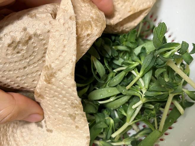 나물을 생으로 무칠 때는 물기 제거가 정말 중요합니다. 나물에 물기가 남아 있으면 양념이 제대로 배지 않고, 무쳐 놓은 뒤 시간이 지나면서 물이 생기거나 맛이 싱겁게 퍼질 수 있습니다. 키친타월로 톡톡 두드려가며 남은 물기를 최대한 제거하세요.