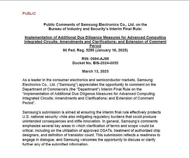 25일 미국 연방정부에 따르면, 지난달 삼성전자는 미국 상무부 산업안보국(BIS)에 ‘첨단 반도체 및 직접회로에 대한 추가 실사 조치’에 관한 잠정 최종 규칙에 대한 의견서를 제출했다. 삼성전자는 “규제가 미국 국가 안보를 보호하는 데 효과적이길 바라지만, 의도치 않은 결과로 혁신을 저해할 우려를 완화해야 한다”고 밝혔다. 중국에 대한 과도한 규제가 오히려 반도체 기술 독립을 촉진할 수 있다는 경고였다.