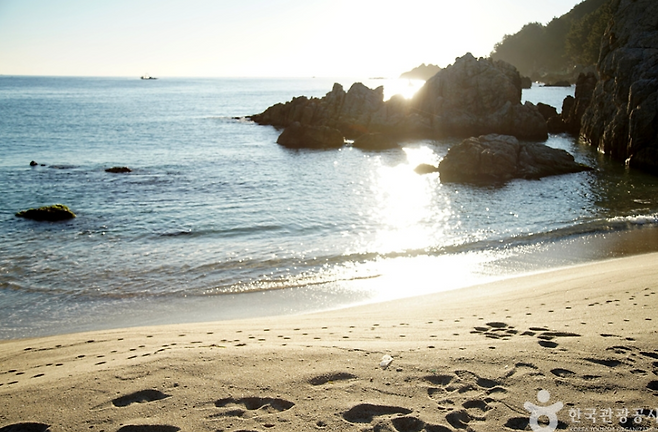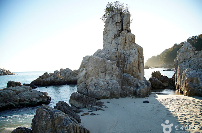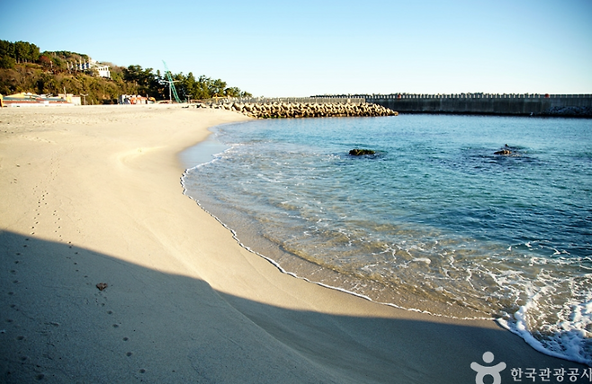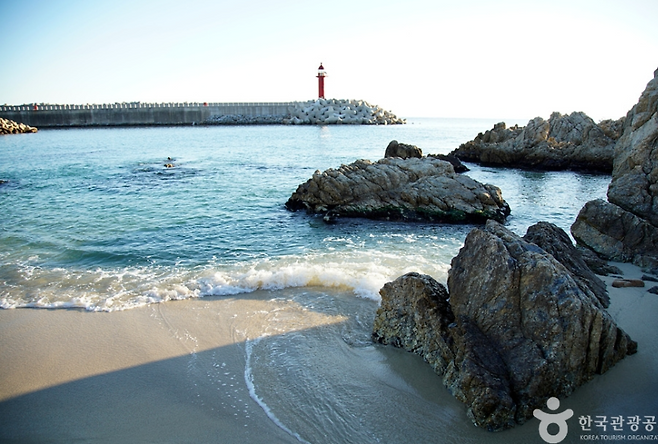 바닷물은 동해답게 맑고 투명하고, 하얀 모래사장은 정갈하게 정비돼 있어 산책만 해도 힐링! 주변에 기암괴석과 갯바위가 많아 스노클링이나 해양 생물 관찰에도 제격이에요.