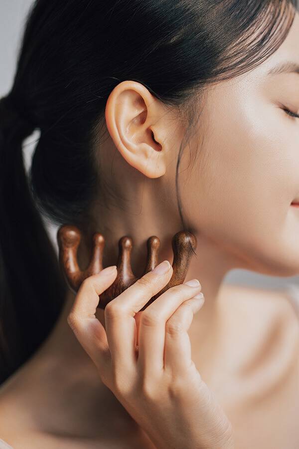 본격적으로 괄사 마사지를 시작하기 전에 얼굴과 목을 스트레칭을 통해 가볍게 풀어주는 것이 좋습니다. 스트레칭 후에는 머리 뒤쪽 두피와 귀 바로 위, 정수리 쪽을 가볍게 쓸어주며 딱딱하고 긴장된 두피를 풀어줍니다. 얼굴 괄사 마사지를 시작하기 전 미리 풀어주면 림프 순환이 원활해지며 마사지 효과를 높일 수 있습니다.