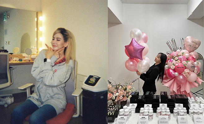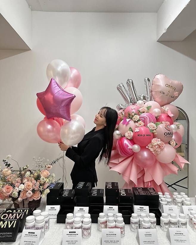 올블랙 의상으로 시크함을 강조하며 핑크 톤의 풍선과 꽃다발이 가득한 이벤트 현장에서 우아한 분위기를 연출하고 있다. 검은색 상의의 심플함이 화려한 배경과 대비되어 세련된 느낌을 자아내고 있다. 긴 생머리를 자연스럽게 내려뜨려 여성스러운 매력을 더했다.