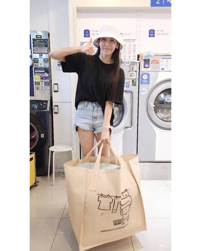 김지우는 검은색 크롭 티셔츠와 연청 데님 숏팬츠를 매치해 편안하면서도 트렌디한 일상 룩을 연출하고 있다. 화이트 버킷햇으로 포인트를 주었으며, 세탁소라는 평범한 공간에서도 자연스러운 매력을 발산하고 있다. 베이지 톤의 에코백을 들고 있어 실용성과 스타일을 모두 잡은 모습이다.