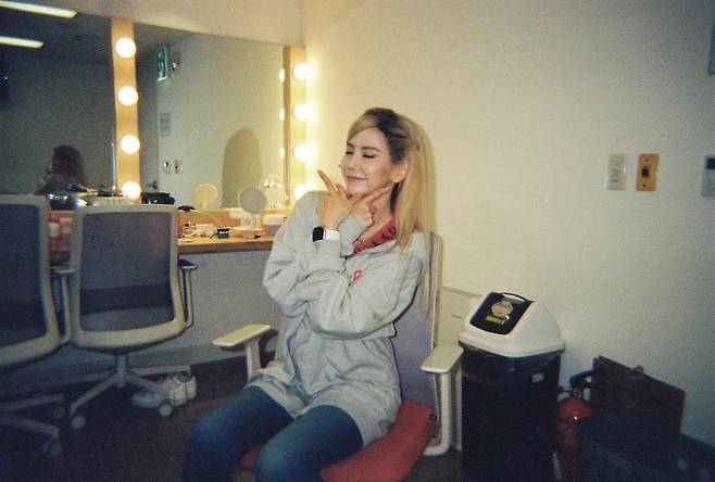 회색 후드티를 착용해 편안하고 캐주얼한 스타일을 연출하고 있다. 메이크업룸이라는 사적인 공간에서 자연스러운 모습을 보여주며, 금발 헤어로 변신한 모습이 인상적이다. 후드티의 여유로운 핏이 편안함을 강조하고 있다.