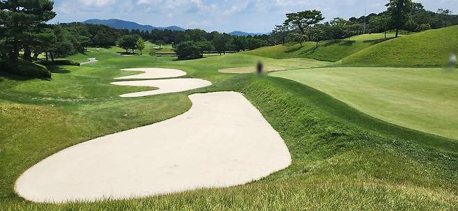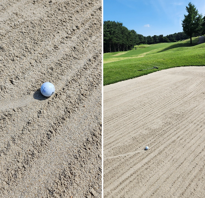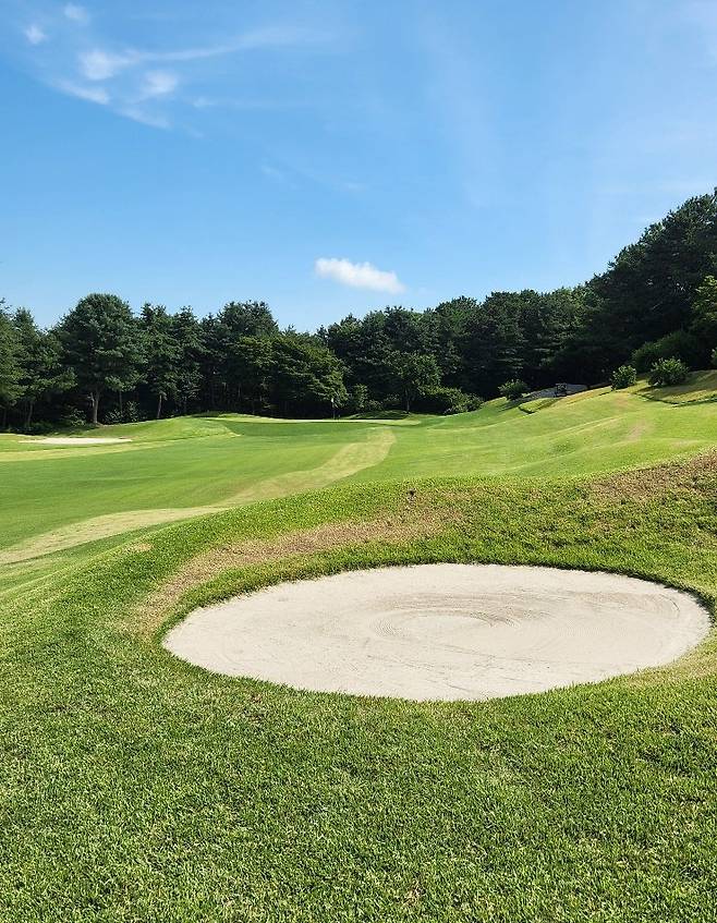 그린 주변의 벙커는 의외로 큰 사이즈가 많았습니다. 벙커 턱도 적당히 높으며 무엇보다 모래가 곱고 부드러워서 정교한 샷이 요구되었습니다. 벙커 위치 또한 그린 위 내리막에 떨어지게 디자인된듯하더군요. 저의 생각으로는 홀 길이가 보통 길이인 대신 벙커 난이도를 약간 더 높였습니다. 반면, 페어웨이 벙커는 오히려 작은 사이즈이지만 앞으로 멀리 나가기 까다로울 정도로 턱이 있었습니다. 모래는 똑같이 부드럽고 고와서 미드 아이언 이상으로 깨끗하게 쳐내기가 쉽지 않았습니다.