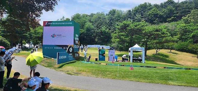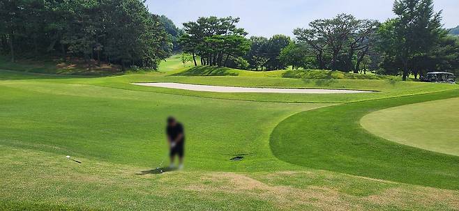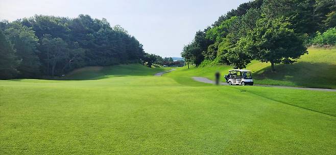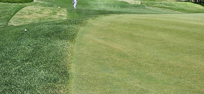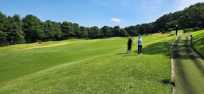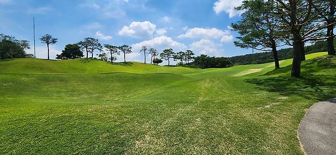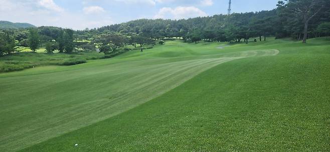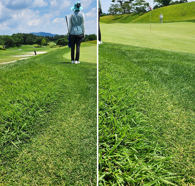 중지 페어웨이로 매우 촘촘하게 관리되어서 공이 잔디 위에 항상 잘 올라서있습니다만 디봇을 떼어 내기엔 상당히 끈질겼습니다. 페어웨이 넓이는 적당했지만, 그린 주변에 다가갈수록 매우 좁아지더군요. 드라이버 착지점 부분의 페어웨이는 대체로 평평해서 보상받는 느낌이었고, 세컨드 샷을 짧거나 양옆으로 놓치면 라이가 어려워지는 현상이 느껴졌습니다. 러프도 대회 때보다 더 짧게 했지만 여전히 끈적하게 플레이 되었습니다. 페어웨이는 대회 후, 다시 넓게 관리하고 있네요.