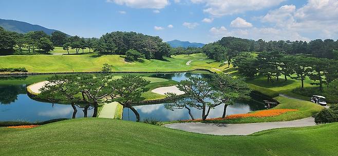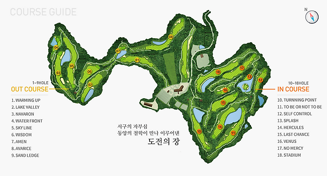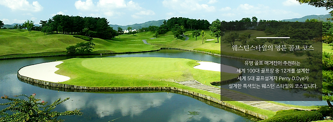[웹사이트에서] 유명 골프 매거진이 추천하는 세계 100대 골프장 중 12개를 설계한 세계 5대 골프 설계자 Perry O.Dye 가 설계한 특색 있는 웨스턴 스타일의 코스입니다. 코스 내에 12개의 연못이 있어 16개의 홀이 연못에 접하고 있으므로 조경미가 우수합니다. 전략적인 연못 배치로 크로스 해저드가 가능하고 특히 아일랜드 그린이 있는 13홀은 골퍼들의 관심을 모으고 있습니다.