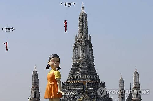 epa11787821 The world's largest Young-hee doll, aka 'Gokova', the iconic doll from Netflix?s South Korean series Squid Game, is seen on a barge on the Chao Prayer River, in front of Wat Arun temple during the Squid Game season 2 promotional event in Bangkok, Thailand, 21 December 2024. The event will be held ahead of the launch of Squid Game season 2, on Netflix on 26 December 2024. EPA/NARONG SANGNAK