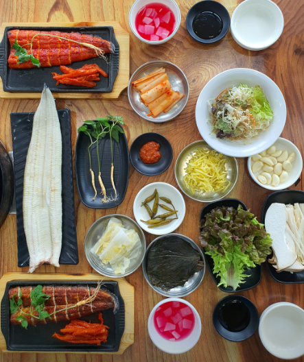 국내산 민물장어만 사용하며, 도톰하고 탱글한 장어는 직원이 직접 구워줘 편하게 즐길 수 있습니다. 야들야들한 장어에 부추무침, 파채무침, 깻잎장아찌가 곁들여져 완벽한 조화를 이룹니다.