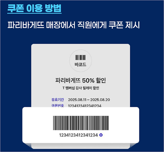 이번 행사는 T멤버십 쿠폰을 통한 오프라인 현장 결제 전용 혜택입니다. 따라서 파리바게트 기프티콘 단독 사용은 가능하지만, 할인 쿠폰과 중복 적용은 불가능합니다. 온라인 주문이나 키오스크 결제도 지원되지 않으므로 반드시 매장 직원에게 쿠폰을 제시해야 합니다.