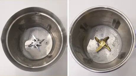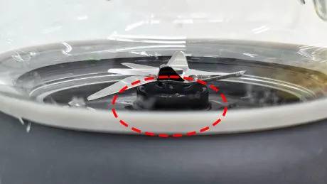 그래서 칼날을 계속 회전시키는 자동 세척 기능을 적극적으로 활용하고, 물로 충분히 헹궈 칼날 아래 쪽이 충분히 씻길 수 있도록 해 줍니다.