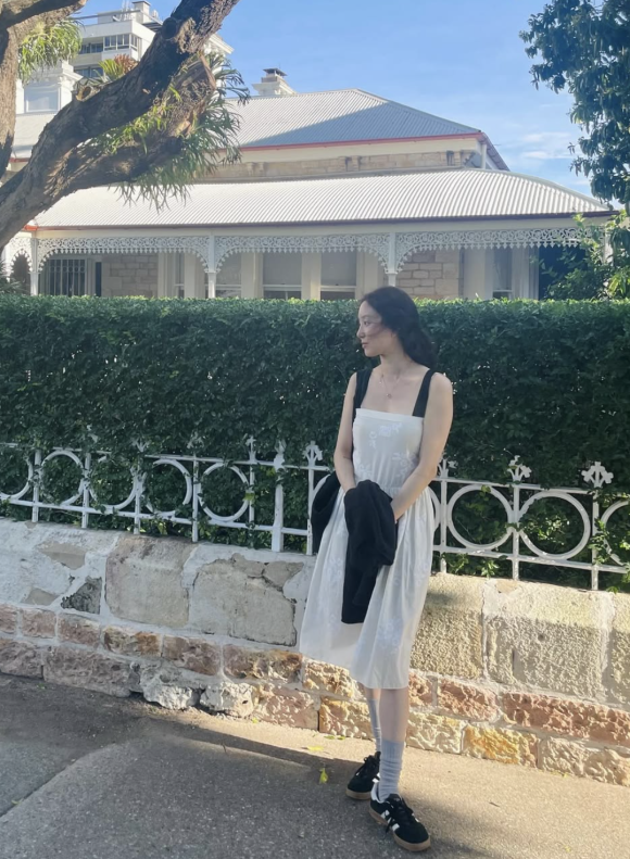 44세라는 나이가 무색할 만큼 경쾌하고 사랑스러운 무드가 담긴 이 룩은, 미우미우의 미니원피스를 통해 완성됐다.