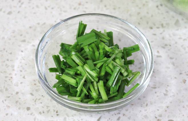 부추는 깨끗이 씻어 2~3cm 길이로 썰어요.