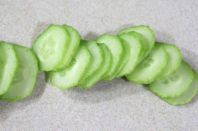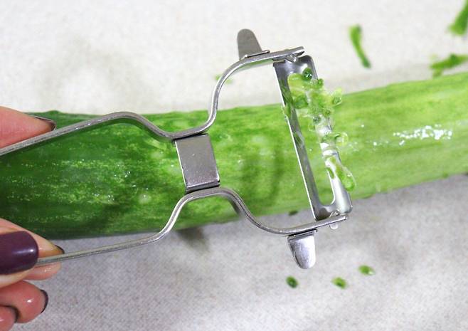 오이 양 끝을 자르고, 깨끗하게 씻어주세요. 필러로 돌기를 정리하면 껍질째 먹어도 부담 없어요.