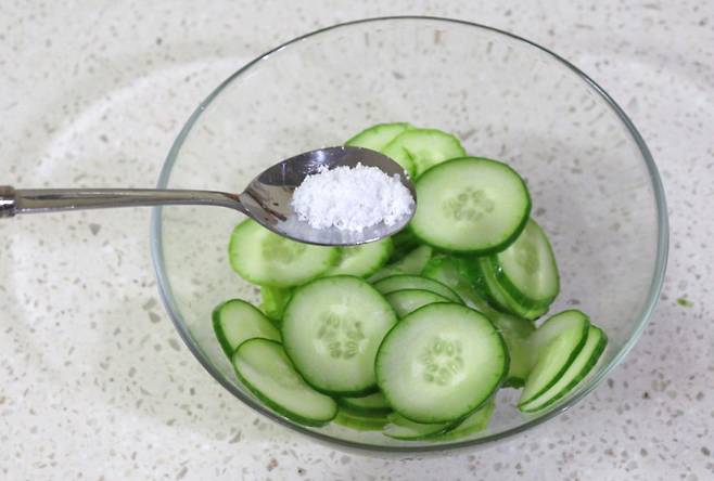 썰어 놓은 오이에 굵은 소금 ½큰술을 뿌려 5~10분 정도 절여요.절인 뒤엔 물기를 꽉 짜서 준비합니다.