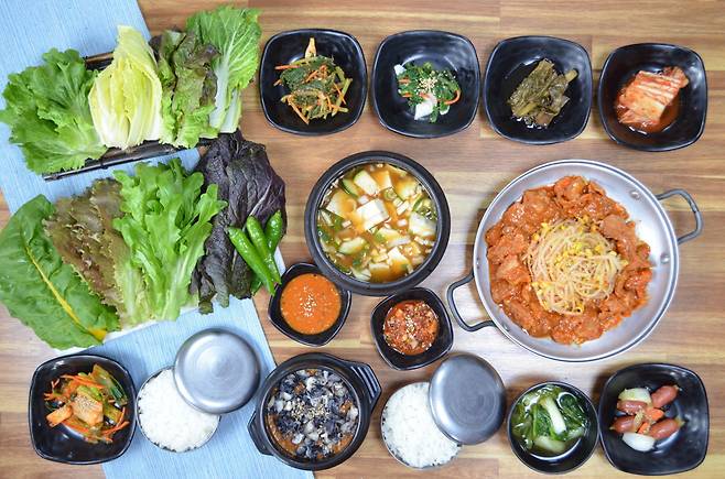 '신선한 쌈 채소'는 효능 정보와 함께 제공되며, 무한 리필이 가능하여 푸짐합니다. 우렁이가 가득한 쌈장이 별미이며, 함께 나오는 제육볶음과 된장찌개의 맛이 훌륭해 집밥처럼 편안하게 즐길 수 있습니다. 모범음식점 표찰이 붙어 있어 신뢰감을 더합니다.