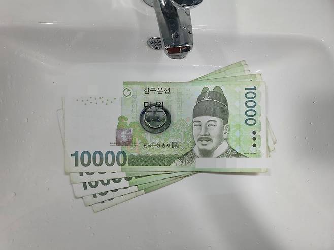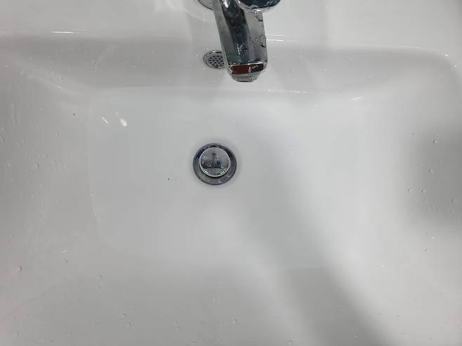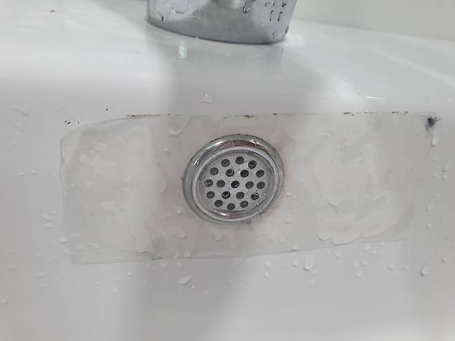 우선 세면대에 물이 넘치는 것을 방지하기 위해서 테이프를 붙여서 막아주세요.