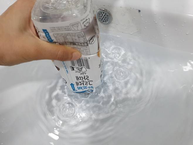 페트병으로 세면대 마개 부분을 막아주신 후 세면대에 물을 받아주세요. 물은 물이 넘치는 것을 방지하는 곳까지 받아주세요.