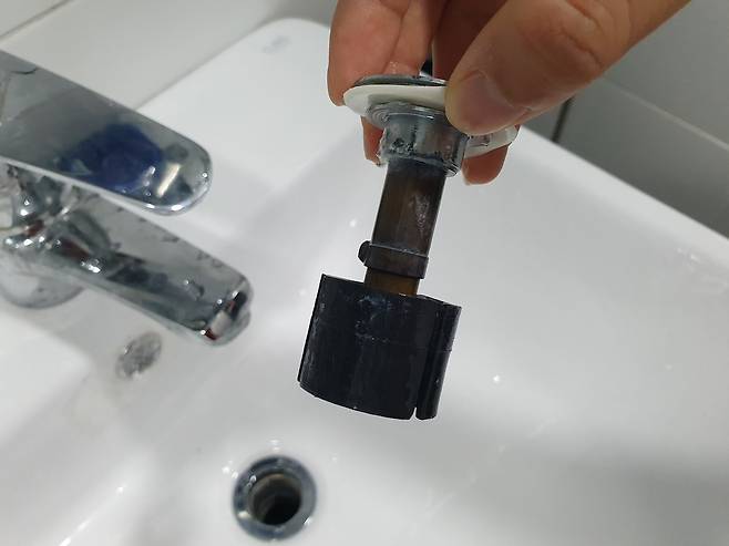세면대 마개는 집집마다 다른데 요즘은 노크식으로 그냥 빼지는 집이 많을 거예요. 그냥 쭉 당겨서 빼주시면 됩니다.