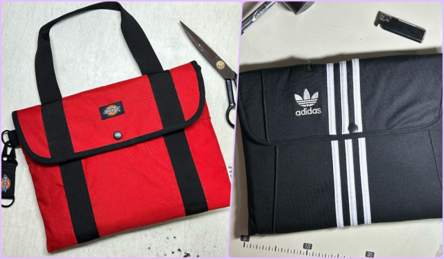 손님들이 보낸 옷을 받으면 대표님은 디자인을 고민하기 시작합니다. "상의는 아무래도 옷의 특색이 프린팅에서 드러나니까 그 부분을 살려서 제작하고, 바지나 재킷은 라벨이나 주머니를 중심으로 디자인한다"는 설명. 디자인대로 재단하고, 짐색이 너무 축 늘어지지 않도록 안감(두꺼운 바람막이 소재라 생활방수 OK)을 덧댄 후 끈을 달면 완성. 짐색 하나당 30~40분 정도 걸립니다.