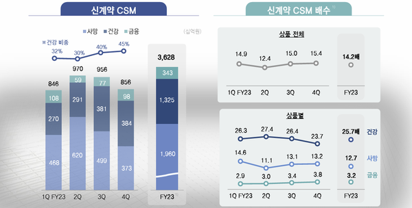 20일 삼성생명의 2023년 실적발표회 자료에 따르면 전체 신계약 CSM 배수는 14.2배로 집계됐다. 세부적으로 건강보험이 25.7배로 가장 높았으며, 사망보험 12.7배, 금융형 상품 3.2배로 그 뒤를 이었다. 2023년 신계약 CSM 중 건강보험 비중은 점점 증가 추세를 보였으며 4분기에는 45%에 이르러 절반에 가까워졌다.
