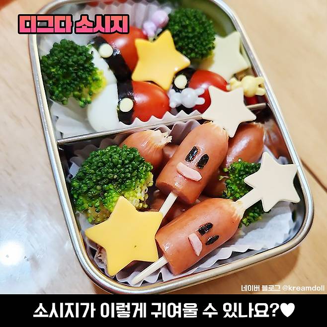 마지막으로 디그다 형태의 소시지도 있겠습니다. 이건 핑크색 소시지에 김으로 눈만 만들어주면 끝나는 거라 난이도가 가장 낮다는 거. 요것 또한 밥심이 도전할 항목으로 찜해버릴게요. 크크. 밥심이 할 수 있다? 그럼 글을 보고 있는 여러분도 완전 가능이라구요.