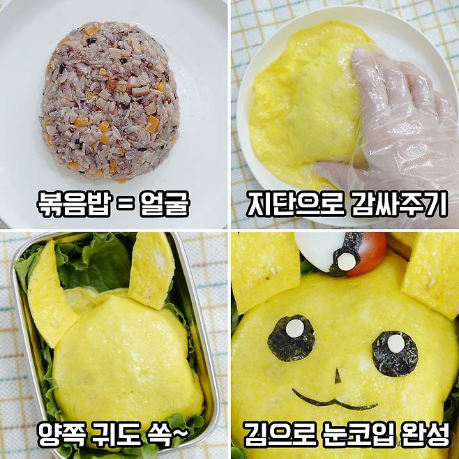 도시락 바닥에 볶음밥을 깔아주고 그 위에 피카츄의 얼굴이 될 지단을 폭 감싸준 후, 피카츄 귀를 각각 붙여주면 일단 형태는 완성쓰. 눈코입은 김+치즈를 이용해주면 된다고 해요. 마지막으로 피카츄의 볼은 방울토마토를 이용해주면 끝!