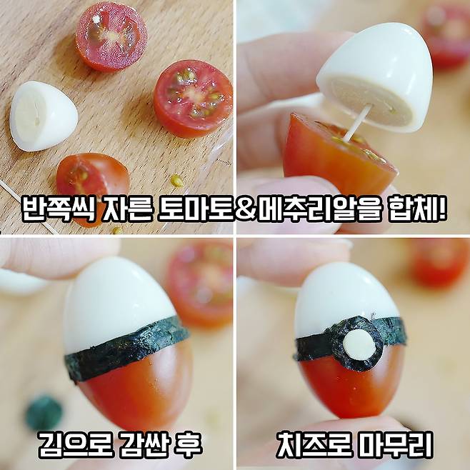 메추리알 반쪽과 방울토마토 반쪽으로 몬스터볼도 만들 수 있어요. 가운데 까만색은 김을 얇게 잘라 붙여주면 된다구요! 요건 밥심도 해볼 수 있을 것 같아요.
