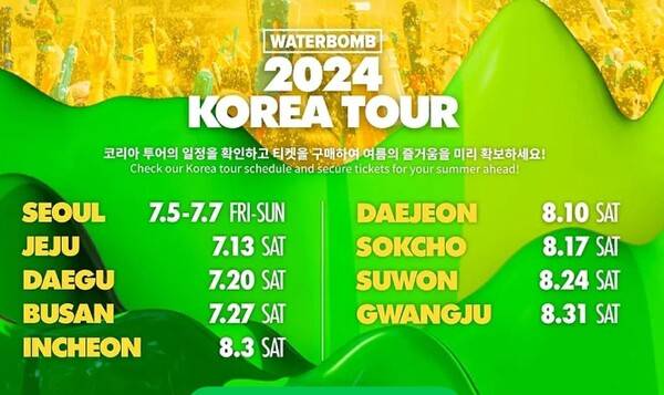 워터밤은 서울외 전국 곳곳 도시에서 열리는데요. 올해 2024 워터밤의 경우 서울, 제주, 대구, 부산, 인천, 대전, 속초, 수원, 여수에서 열릴 예정이며 참가하는 가수 라인업도 지역마다 다릅니다.