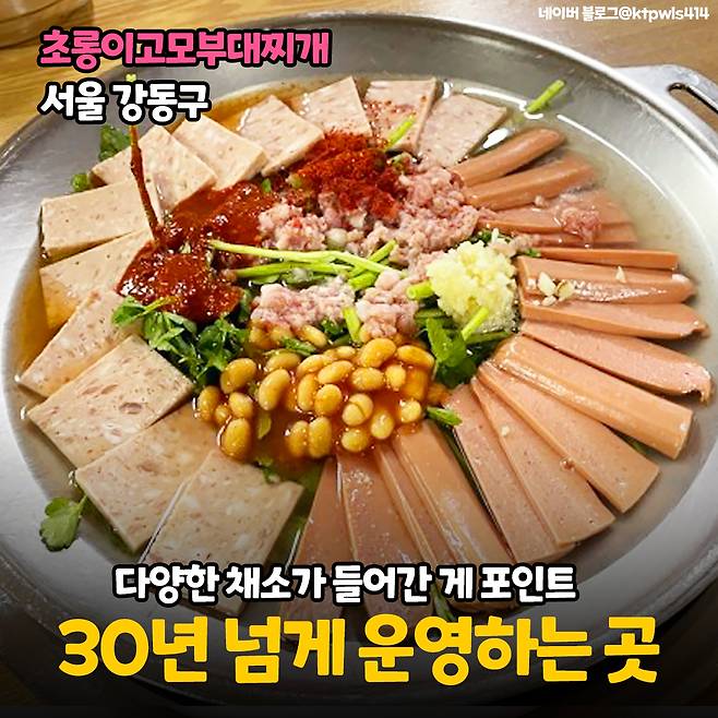 초롱이고모부대찌기는 30년 넘게 운영되고 있는 노포 부대찌개 맛집이에요. 100% 한우 사골육수를 우려 묵은지와 함께 깊은 맛을 내고 있다고 해요~ 이곳도 2014년부터 블루리본 스티커를 받아온 곳이랍니다.