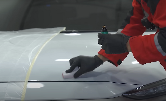이번 실험의 경우 직접 DIY로 유리막 코팅을 시공한 후 설명서에 나와있는 대로 7일간 건조과정을 거치고 나서 진행을 하였습니다. 시공을 하고 나서 7일 뒤 상태를 보았을 때 코팅이 잘 되어있어 물이 뭉치지 않고 잘 흘러내리며 쉬팅력 또한 높은 모습을 볼 수 있었습니다.