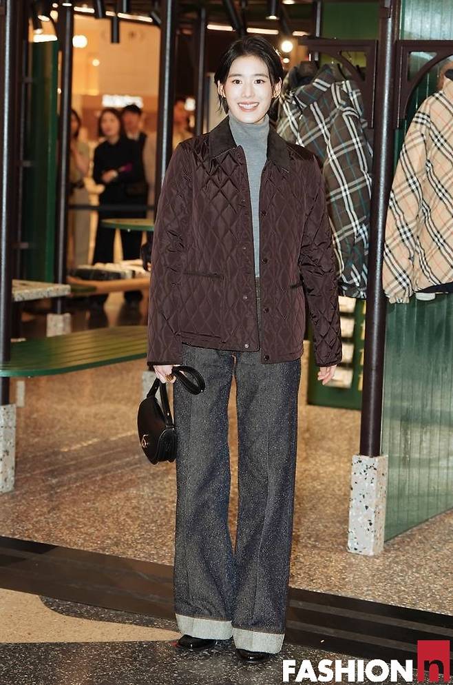 정은채는 퀼팅 패딩 재킷과 터틀넥, 데님 팬츠를 매치한 클래식한 윈터룩으로 늘씬한 각선미를 자랑했다.
