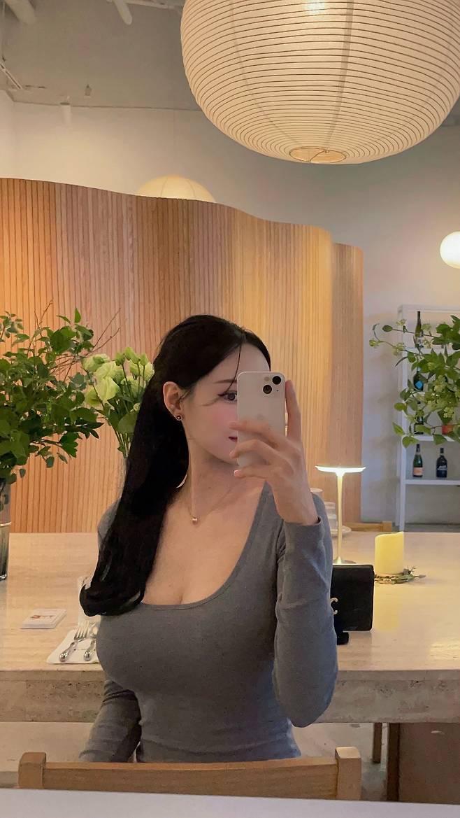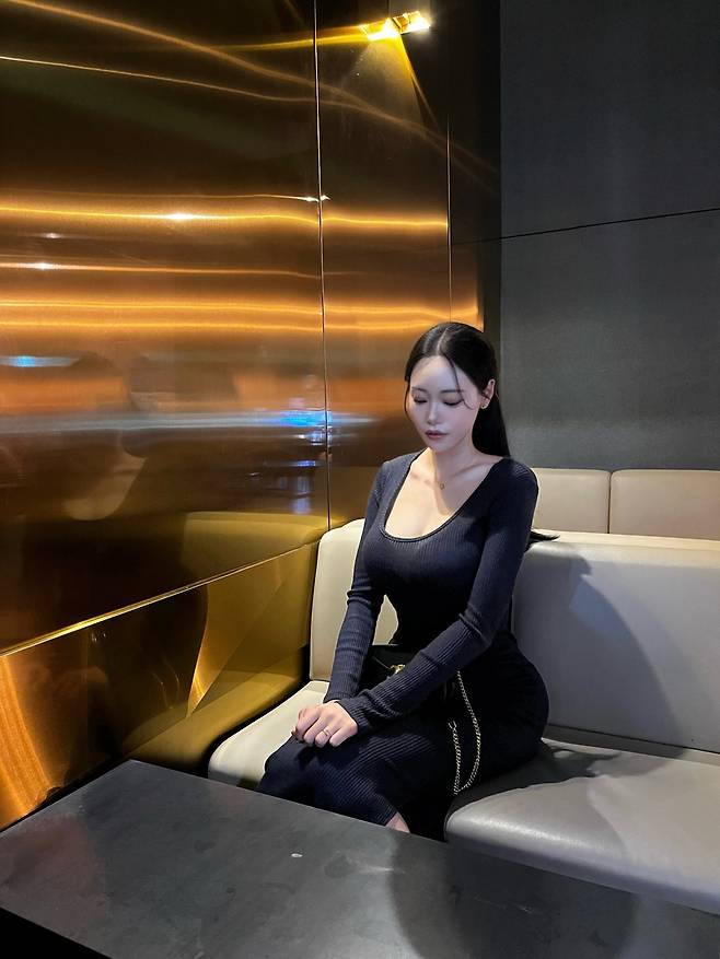 넥라인이 과하지 않게 파여 있어 여리한 쇄골과 목선을 드러내며, 전체적으로 슬림한 인상을 줍니다.