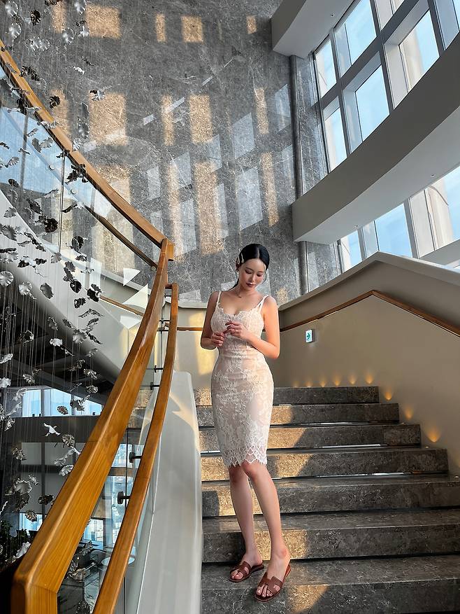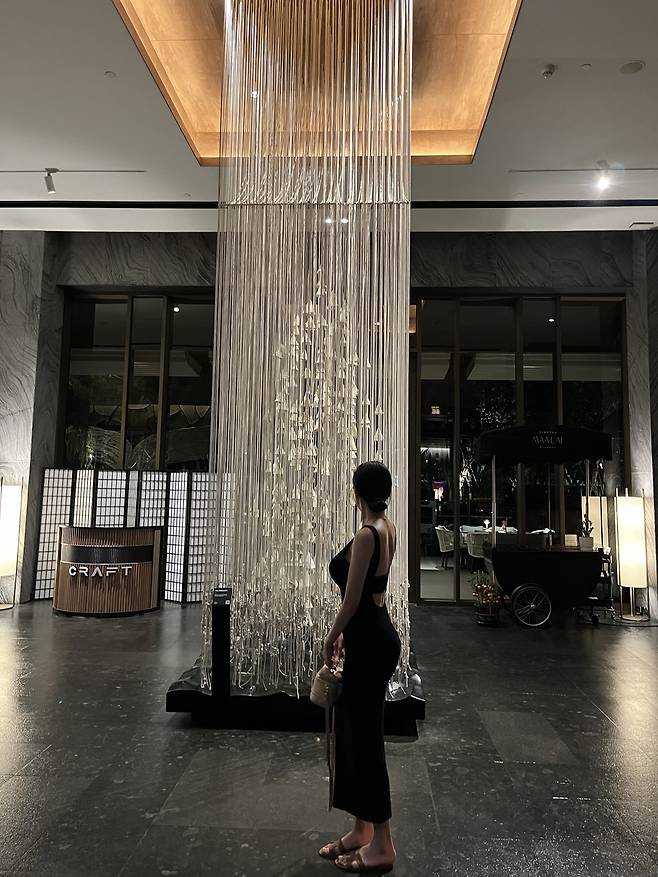 라운지, 계단, 로비 등 호텔 내 공간을 옮겨 다닐 때도 이 원피스 하나면 충분해요.
