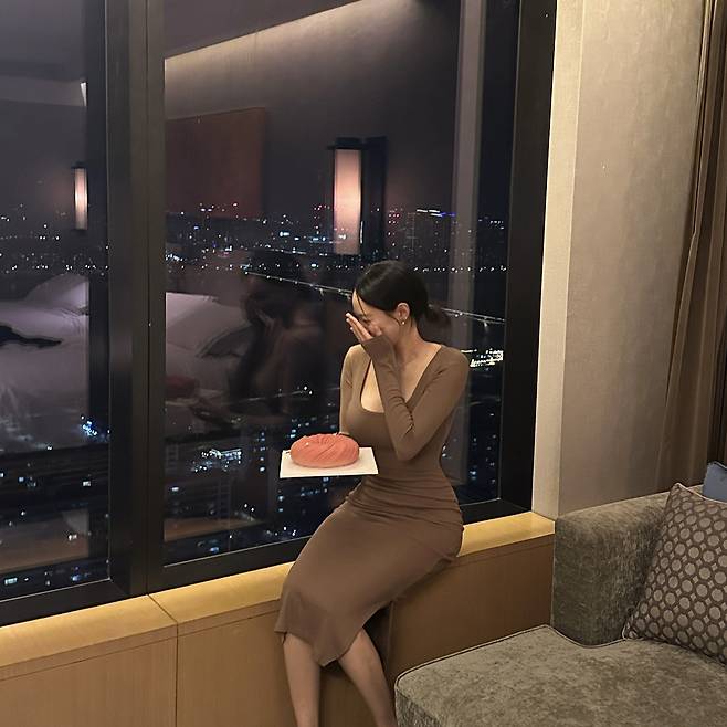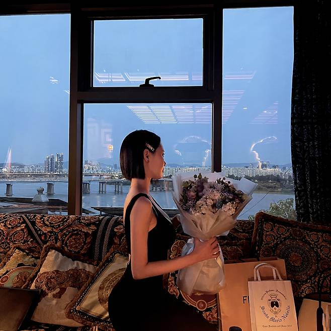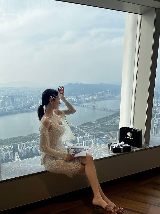 넓게 펼쳐진 도심 뷰 앞에서도 원피스 하나만으로 압도적인 실루엣이 완성돼요.