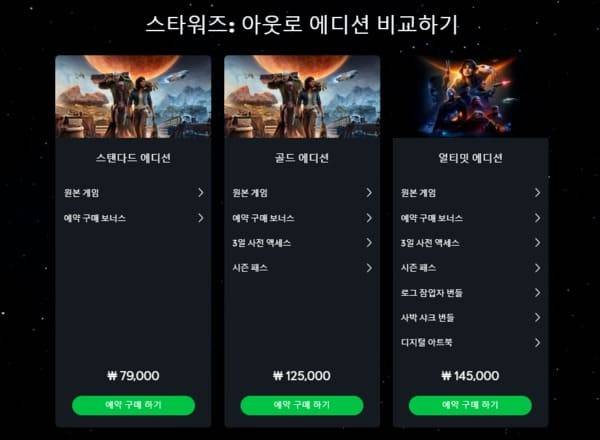 스타워즈 아웃로는 스탠다드, 골드, 얼티밋 에디션으로 출시되며 가격 정책이 많은 비판을 받고있습니다. 기본 스탠다드 에디션은 약 70달러 가량으로 출시되는 최신 AAA게임들과 비슷하지만, 각종 혜택이 주어지는 골드 에디션과 얼티밋 에디션은 터무니 없는 가격이라는 평가가 많습니다.