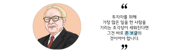 워런 버핏은 "투자자를 위해 가장 많은 일을 한 사람을 기리는 조각상이 세워진다면 그건 바로 존 보글의 것이어야 합니다."라고 칭찬하며, 일반투자자에게는 개별 주식 투자보다 인덱스 펀드가 더 적합하다고 말하기도 했습니다.