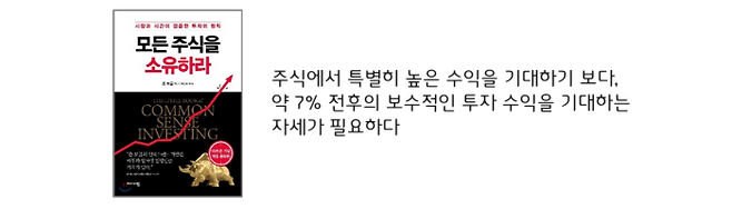존 보글은 그의 저서 "모든 주식을 소유하라."에서 주식에서 특별히 높은 수익을 기대하기 보다, 약 7% 전후의 보수적인 투자 수익을 기대하는 자세가 필요하다고 강조합니다. 금융상품에서 기대하는 수익률은 해당 상품이 가진 위험(변동성)에 비례하기 때문에 전체 시장으로 잘 분산된 포트폴리오(시장포트폴리오)를 통한 투자는 같은 기대수익률 하에서 위험을 가장 낮출 수 있는 방법이기 때문입니다.