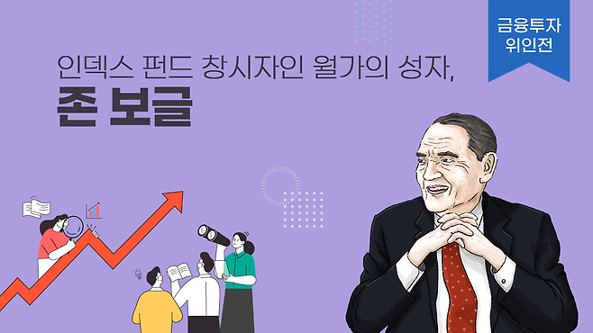 존 보글은 투자자들이 주식시장에서 특별히 높은 수익을 기대하기보다, 약 7% 정도의 수익을 기대하며, 최대한 비용을 낮추어서 투자해야 한다고 말합니다. 그는 효율적인 투자는 거래나 운용 등에 들어가는 비용을 최소화하는 것이라는 생각으로 시장 전체를 담은 인덱스 펀드를 만들어 많은 사람이 손쉽게 투자할 수 있도록 했습니다.