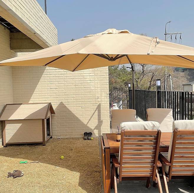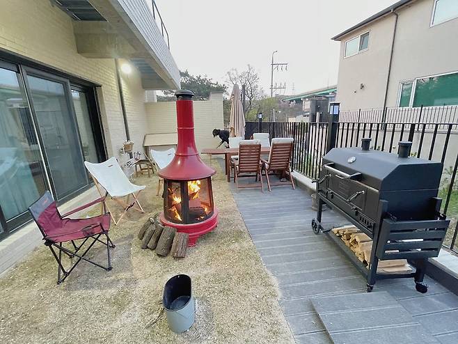 무엇보다도 빼놓을 수 없는 공간은 테라스다. 강아지의 운동장이자 부부의 힐링 타임을 위한 장소인 이곳은, 작은 텃밭까지 갖췄다. 파라솔과 테이블, 화로를 배치해 작지만 알찬 홈캠핑 기분을 낼 수 있고, 야외 바비큐는 이 집만의 변하지 않는 주말 의식이다.