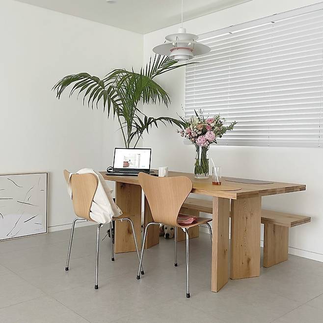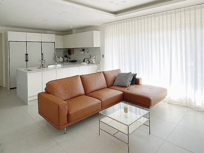 신혼집은 기본적으로 화이트 컬러와 우드를 중심에 두고 꾸몄다. 거실은 모던하고 차분한 그레이 톤의 타일과 큰 유리창으로 채광과 개방감을 채웠고, 가족이 함께 모여도 붐비지 않을 만큼 여유롭다.