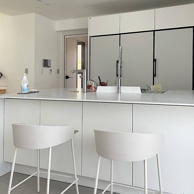 주방은 매트 화이트의 한샘 가구로 마감했고, 수납력에 중점을 두었다. 때 묻는 걸 걱정하는 의견도 있었지만 매일 닦으며 관리하다 보면 오히려 더 청결을 유지하기 쉬웠다는 경험이 전해진다. 아일랜드 식탁과 빌트인 후드는 전체 디자인의 통일감을 높이는 중요한 요소였다.